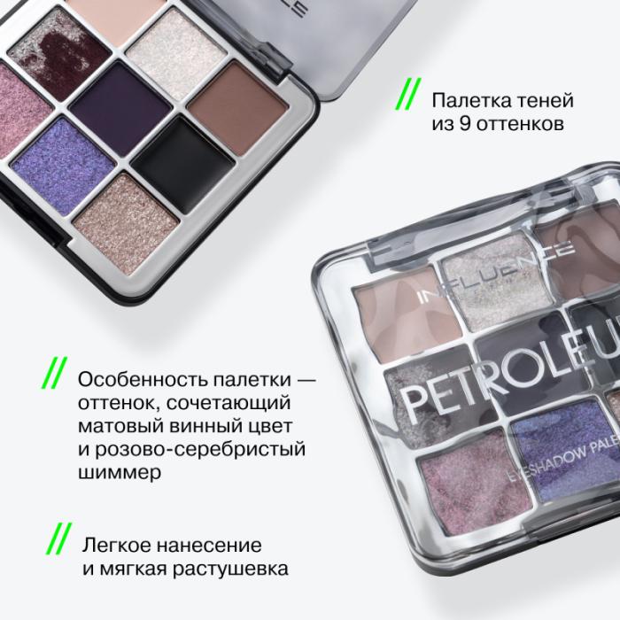 Палетка теней PETROLEUM от INFLUENCE BEAUTY — сочетание девяти тонов от натуральных нюдовых для базового макияжа до ярких мерцающих теней-спарклов с влажным финишем для выразительного вечернего образа.