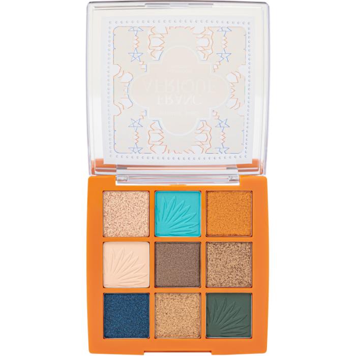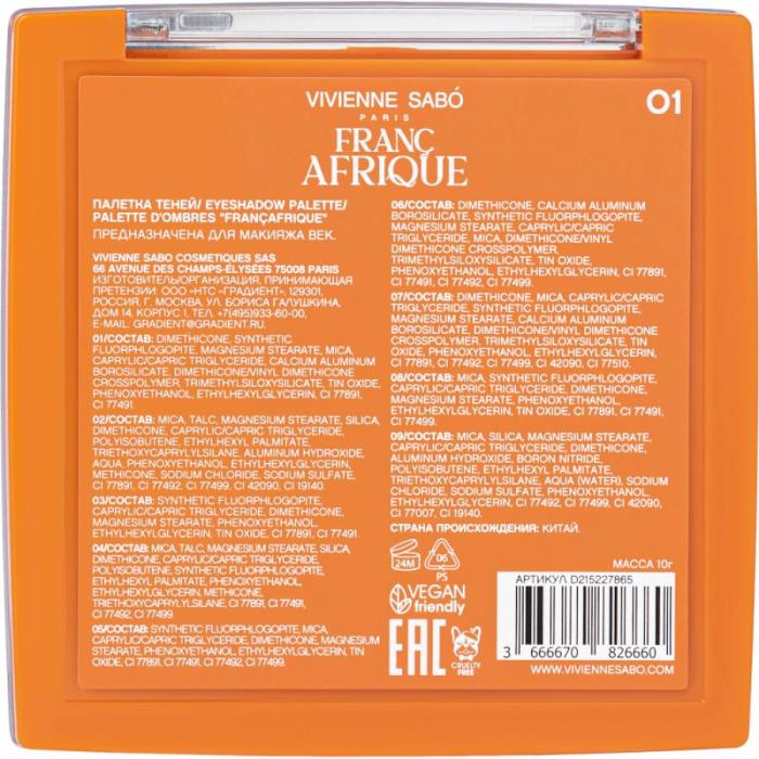 Палетка теней FRANÇAFRIQUE от VIVIENNE SABÓ станет ее идеальным отражением. В палитре представлены девять тонов: светло-бежевый, лазурный, хромовый зеленый с матовым финишем, золотистые спарклы и
