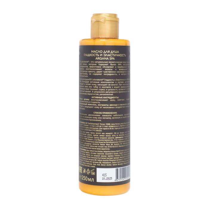 Масло для душа EO Laboratorie® Гладкость и эластичность ARGANA SPA, благодаря активным компонентам в составе, деликатно очищает и питает кожу, насыщает ее влагой. При нанесении на влажное тело или губку и контакте с водой превращается в шелковую пену! Снимает стресс и усталость, оставляет на коже приятный аромат. В результате регулярного применения масла кожа нежная, бархатистая, увлажненная.