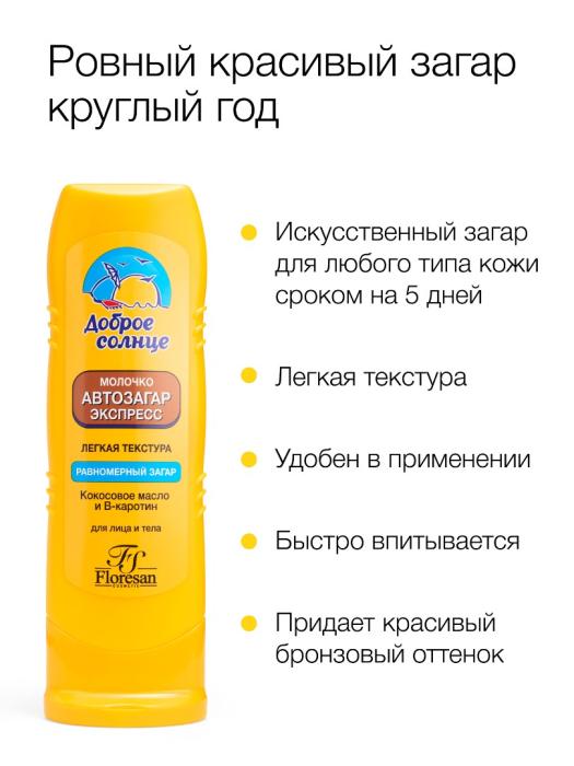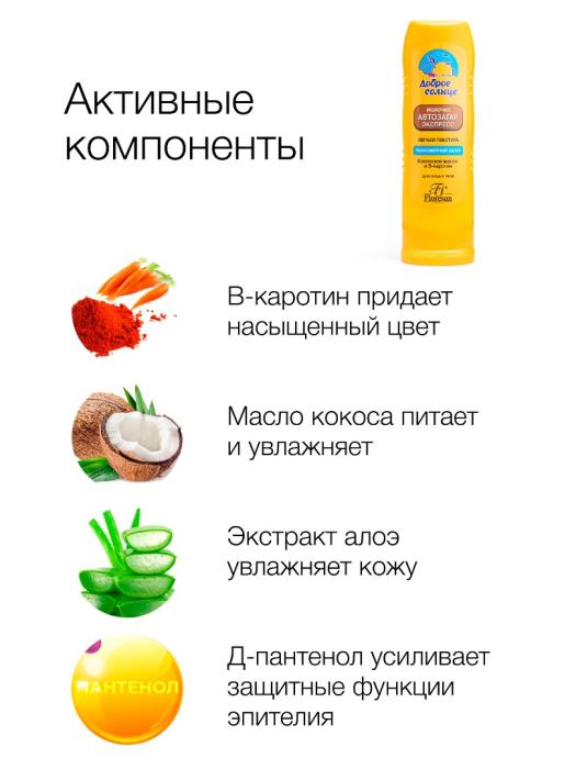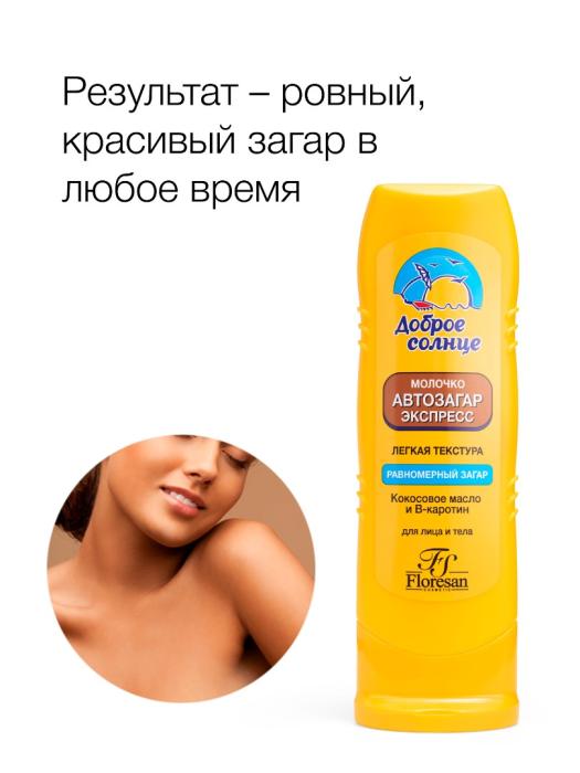 Средство предназначается для получения искусственного загара лица и тела для всех типов кожи. Через 3-4 часа после нанесения молочка кожа приобретает цвет естественного загара, стойко сохраняющегося сроком до 5 дней.