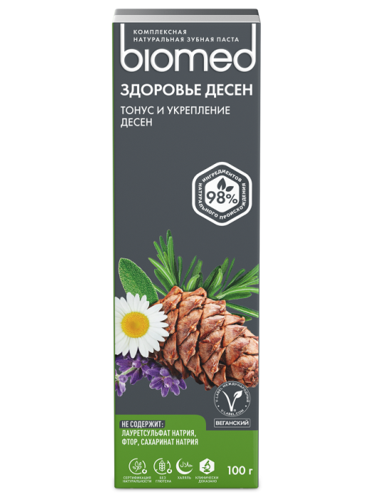 Противовоспалительная зубная паста Biomed® GUM HEALTH с насыщенным содержанием растительных экстрактов против бактерий и неприятного запаха изо рта, успокаивает десны и снижает кровоточивость. Клинически доказано: снижение воспалений и снижение кровоточивости десен в 2 раза за 4 недели.