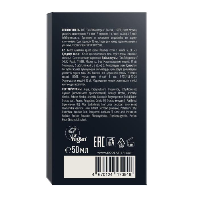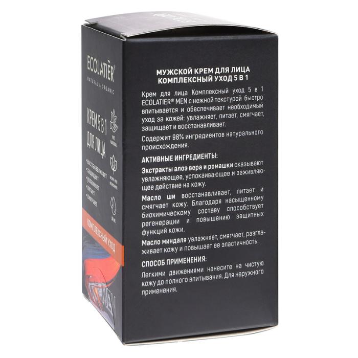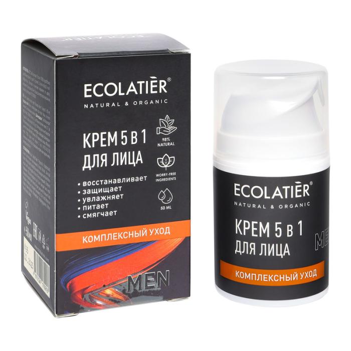 Крем для лица Комплексный уход 5 в 1 ECOLATIER® MEN с нежной текстурой быстро впитывается и обеспечивает необходимый уход за кожей: увлажняет, питает, смягчает, защищает и восстанавливает.