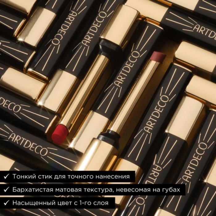 Помада-карандаш Lip Rouge Stylo сочетает насыщенный цвет, максимальный комфорт и элегантный дизайн. Бархатистая матовая текстура обеспечивает плотное покрытие с первого слоя, ощущаясь на губах невесомой шелковистой вуалью. Тонкий стик позволяет нанести помаду точно и аккуратно. После нанесения помада образует тончайшее эластичное покрытие и долго держится на губах. Формула с карнаубским воском сохраняет губы мягкими. Элегантный дизайн в стиле арт-деко и тонкий алюминиевый корпус создают ощущение роскоши и праздника.