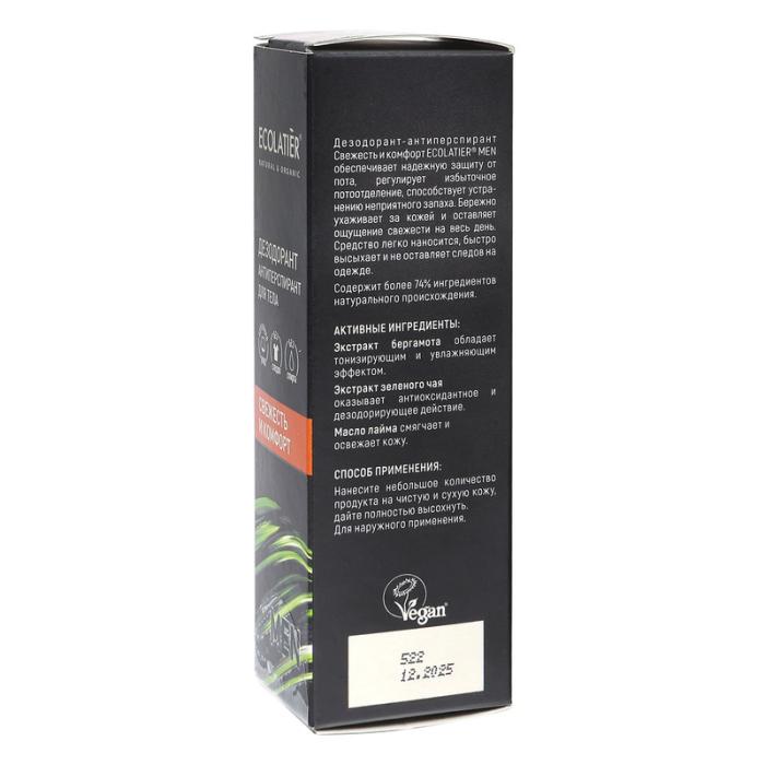 Дезодорант-антиперспирант Свежесть и комфорт ECOLATIER® MEN обеспечивает надежную защиту от пота, регулирует избыточное потоотделение, способствует устранению неприятного запаха. Бережно ухаживает за кожей и оставляет ощущение свежести на весь день. Средство легко наносится, быстро высыхает и не оставляет следов на одежде.