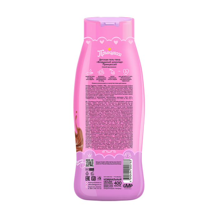 Настоящим сладкоежкам посвящается! Невероятно вкусный и воздушный! Гель-пена - просто незаменимое средство для бережного ухода и мягкого очищения детской кожи, делает ее гладкой и бархатистой, а шоколадный аромат придает бодрость и солнечное настроение. Настоящее шоколадное удовольствие для любимой Принцессы! Используйте как гель для душа и как пену для ванны - просто добавьте гель в воду и взбейте пышное шоколадное пенное облако. Состав гель-пены адаптирован для детской кожи и богат натуральными экстрактами и активными компонентами.