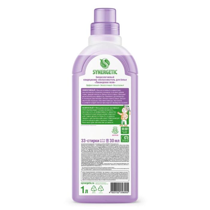 Биоразлагаемый кондиционер-ополаскиватель для белья SYNERGETIC "Лавандовое поле" – высокоэффективное средство, бережно ухаживающее за всеми типами ткани, в том числе деликатными, и придающее особую мягкость и нежность белью после стирки. Гипоаллергенный кондиционер-ополаскиватель нейтрализует остатки средств для стирки на ткани, помогает сохранить структуру ткани, защищая волокна от изнашивания и повреждения. Средство обладает антистатическим эффектом. Комплекс растительных К-тензидов обеспечивает легкую глажку белья. Гипоаллергенная парфюмерная композиция с эфирными маслами лаванды, бергамота и шалфея придает белью прохладный лавандовый аромат. Подходит для ручной и машинной стирки, легко выполаскивается из тканей. Кондиционер подходит для стирки детского белья 0+ и одежды людей с чувствительной кожей. Международный экологический сертификат ICEA подтверждает биоразлагаемость, безопасность и эффективность средства. Биоразлагаемые компоненты не вредят микрофлоре септических установок при использовании средства в соответствии со способом применения.