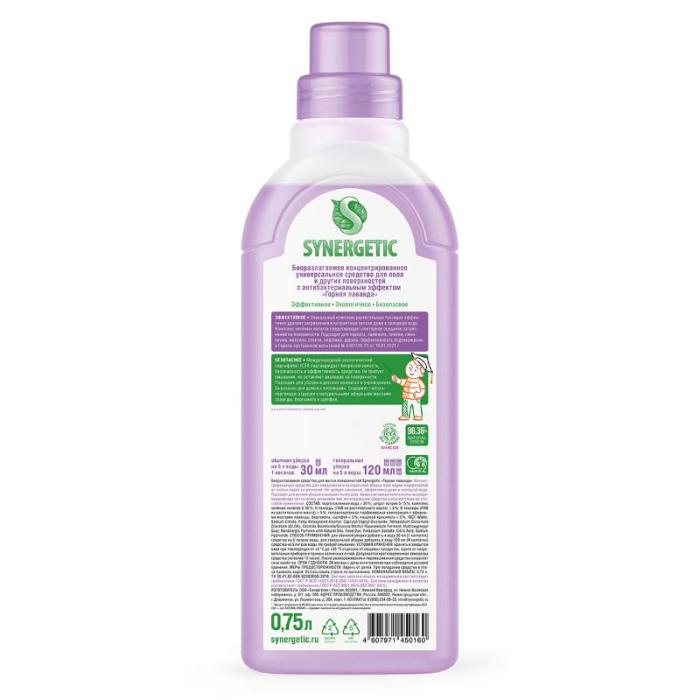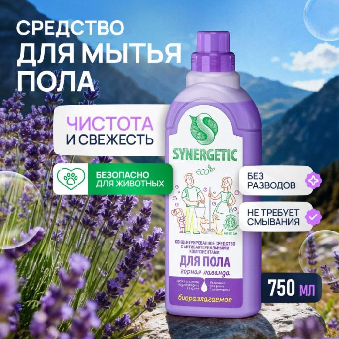 Биоразлагаемое концентрированное средство SYNERGETIC "Горная лаванда" - универсальное средство для ежедневной и генеральной уборки пола и других поверхностей от любых видов загрязнений. Уникальный комплекс растительных тензидов эффективно удаляет загрязнения и неприятные запахи даже в холодной воде. Комплекс зеленых хелатов предотвращает повторное оседание загрязнений на поверхности. Подходит для паркета, ламината, плитки, линолеума, металла, стекла, пластика, дерева. Эффективность средства подтверждена в Европе. Гипоаллергенная парфюмерная композиция на основе эфирных масел лаванды, бергамота и шалфея оставляет легкий, приятный, ненавязчивый аромат. Международный экологический сертификат ICEA подтверждает биоразлагаемость, безопасность и эффективность средства. Не требует смывания, не оставляет разводов на поверхности, подходит для уборки в детских комнатах и учреждениях, а также безопасно для домов с питомцами. Средство подходит как для ручной уборки, так и для моющих пылесосов. Биоразлагаемые компоненты не вредят микрофлоре септических установок при использовании средства в соответствии со способом применения.