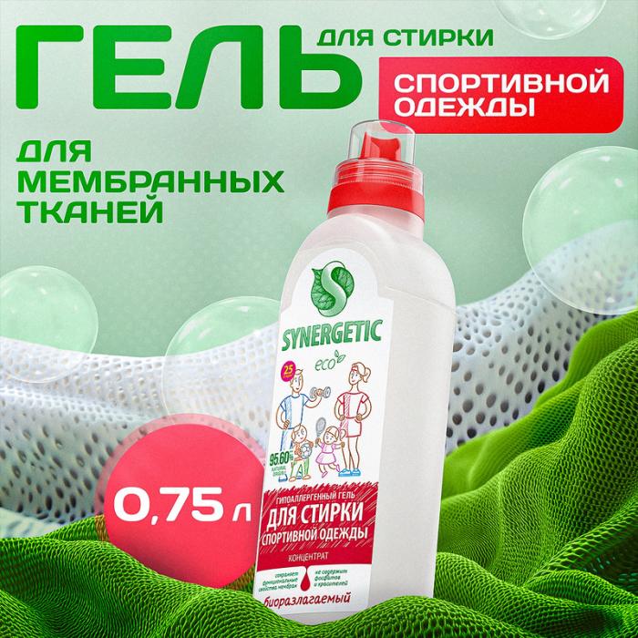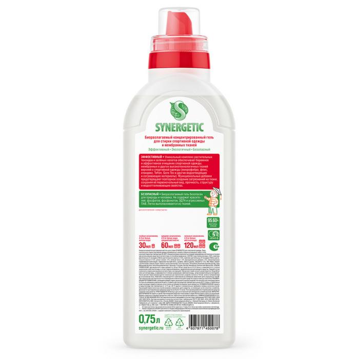 Биоразлагаемый концентрированный гель для стирки SYNERGETIC для спортивной одежды и мембранных тканей предназначен для стирки спортивной одежды и мембранных тканей в стиральных машинах любого типа и ручной стирки при температуре 20-90 °C. Уникальный комплекс растительных тензидов и зеленых хелатов обеспечивает бережное и эффективное очищение спортивной одежды, мембранных и других высокотехнологичных тканей. Идеально подходит для стирки верхней и спортивной одежды из микрофибры, флиса, спандекса, тканей Teflon, Gore-Tex и других водоотводящих и согревающих материалов. Функциональные добавки предотвращают повторное оседание загрязнений на ткани, сохраняя ее первоначальный вид, прочность, структуру и водоотталкивающие свойства. Гипоаллергенная парфюмерная композиция с эфирными маслами мяты, шалфея, чайного дерева и эвкалипта оставляет легкий и приятный аромат. Биоразлагаемый гель безопасен для природы и человека, не содержит красителей, фосфатов, фосфонатов, ЭДТА и агрессивных ПАВ. Средство легко выполаскивается из тканей, оставляя чистоту и свежесть. Биоразлагаемые компоненты не вредят микрофлоре септических установок при использовании средства в соответствии со способом применения.
