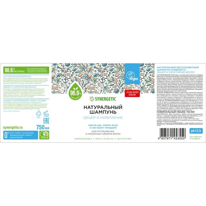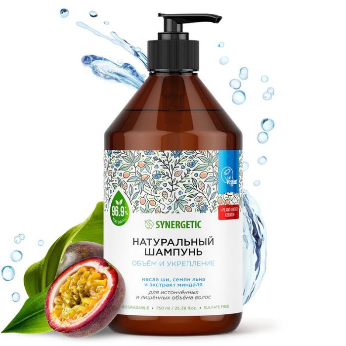 Натуральный бессульфатный шампунь SYNERGETIC "Объём и укрепление волос" - эффективное средство для очищения кожи головы и волос. Бессульфатный шампунь обеспечивает деликатное очищение, эффективный уход за волосами и защиту кожу головы. Растительный кератин восстанавливает структуру волос изнутри, делая их плотными, сильными и упругими. Специально разработанная формула на основе масел ши и семян льна питает тонкие ослабленные волосы и увеличивает объем. Активные компоненты шампуня укрепляют волосы и стимулир