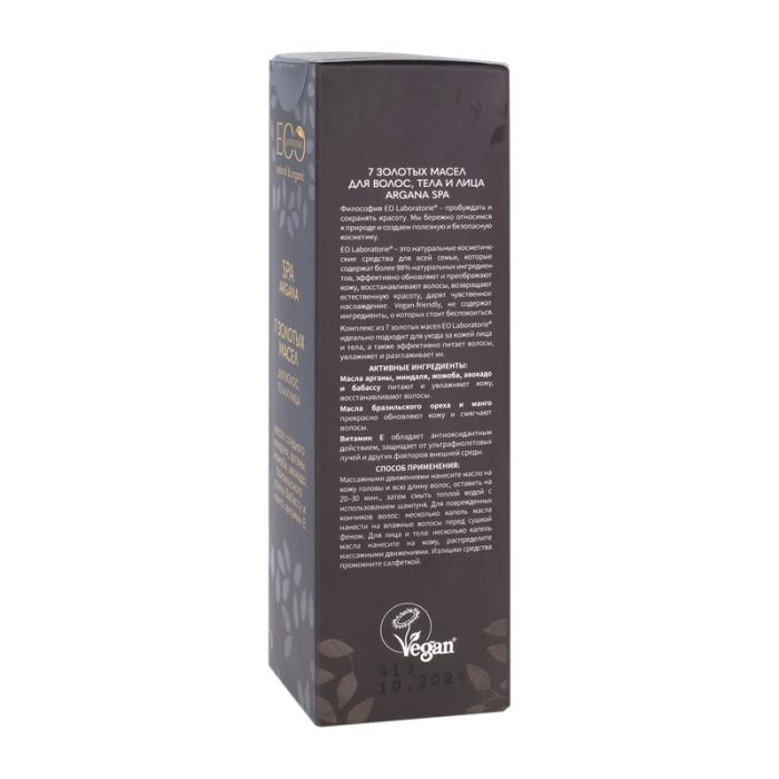Комплекс из 7 золотых масел EO Laboratorie® идеально подходит для ухода за кожей лица и тела, а также эффективно питает волосы, увлажняет и разглаживает их.