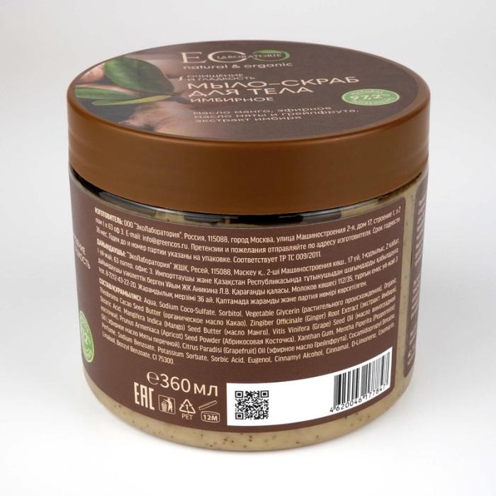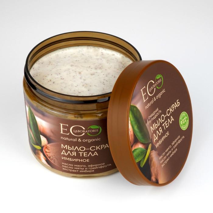 Мыло-скраб для тела EO Laboratorie® Имбирное, благодаря активным компонентам в составе, деликатно очищает, тонизирует кожу насыщает ее питательными веществами. В результате применения мыла кожа становится бархатистой, увлажненной. Активные ингредиенты: Экстракт имбиря тонизирует и подтягивает кожу, возвращая упругость, способствует выведению токсинов. Эфирное масло мяты перечной освежает и тонизирует, помогает сохранять баланс влажности кожи. Эфирное масло грейпфрута содержит большое количество витаминов и минеральных веществ, предотвращает появление целлюлита. Масло манго обладает регенерирующим, увлажняющим, солнцезащитным свойством, снимает напряжение и усталость.
