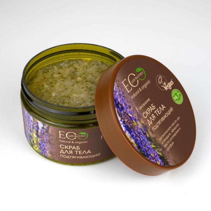 Скраб для тела EO Laboratorie® Подтягивающий на основе морской соли и натуральных масел заменяет несколько косметических средств, нежно очищает и питает кожу. Cкрабирующие частички деликатно удаляют отмершие клетки, стимулируют обновление эпидермиса. Ценные масла в составе проникают глубоко в кожу, оказывая интенсивное питание и восстановление, делая ее свежей и ухоженной. Активные ингредиенты:Органическое масло ши и миндаля питают, увлажняют и смягчают кожу, делают ее нежной и гладкой. Эфирное масло розмарина обладает антисептическим действием, стимулирует обменные процессы в клетках. Эфирное масло шалфея оказывает успокаивающее и вяжущее действие, способствует улучшению состояния кожи, тонизирует, особенно эффективен для жирной и нормальной кожи.