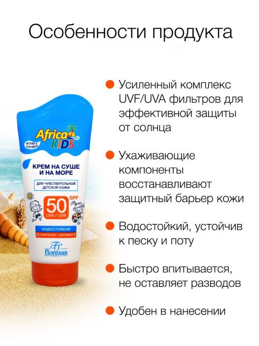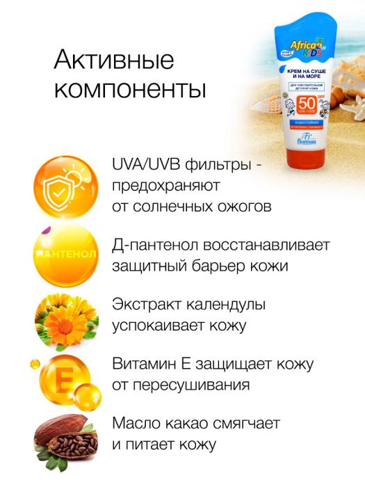 Нежный крем серии Africa kids создан специально для сверхчувствительной к солнцу детской кожи при нахождении, как на суше, так и в воде. Комплекс УФ-А и УФ-B фильтров, масло какао-бобов, витамин Е максимально эффективно защищают кожу от вредного воздействия солнечных лучей и свободных радикалов. Водостойкая формула обеспечивает защиту кожи на длительный срок во время пребывания на солнце и после водных процедур