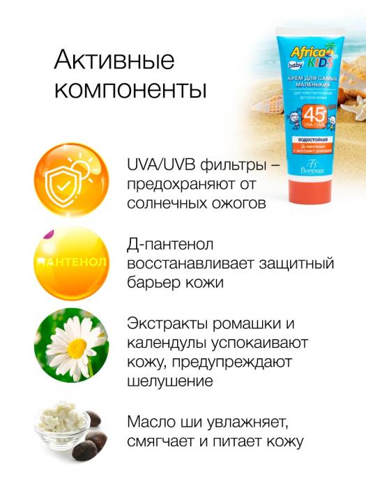 Нежный крем серии Africa kids создан специально для сверхчувствительной к солнцу детской кожи при нахождении, как на суше, так и в воде. Усиленный комплекс УФ-А и УФ-B фильтров, Д-пантенол и экстракт ромашки максимально эффективно защищают кожу от вредного воздействия ультрафиолетовых лучей и предохраняют кожу от появления солнечных ожогов. Водостойкая формула обеспечивает защиту кожи на длительный срок во время пребывания на солнце и после водных процедур. Смягчает и увлажняет кожу.