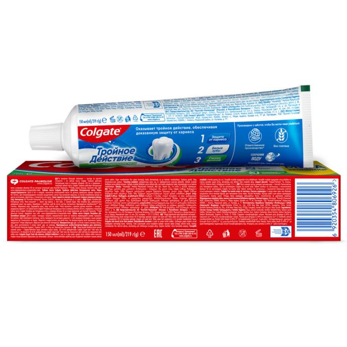 Паста, предназначенная для зубов от производителя Colgate обеспечивает максимальную защиту от кариеса. Эта трехцветная зубная паста оказывает тройное действие: помогает защищать зубы от кариеса, помогает удалять потемнения с поверхности зубов и освежает дыхание. Что немаловажно, Колгейт Тройное Действие обладает приятным мятным вкусом!