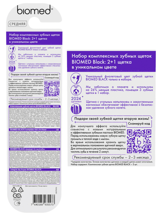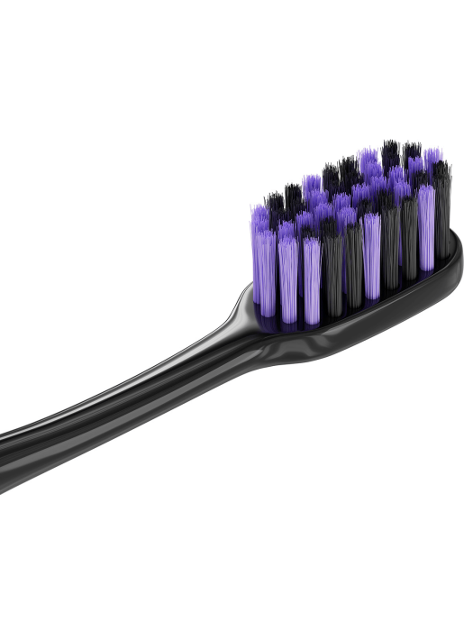 Набор комплексных зубных щеток Biomed Black: 2+1 щетка в уникальном фиолетовом цвете! • СРЕДНЯЯ ЖЕСТКОСТЬ щетинок сохраняет баланс между эффективным очищением и деликатным уходом • ЩЕТИНА С ДРЕВЕСНЫМ УГЛЕМ обеспечивает эффективное удаление налета, осветление и полировку эмали, восстанавливая её естественное сияние