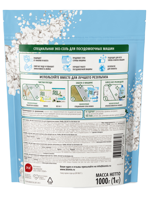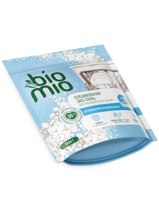 Засыпьте соль в предназначенный отсек посудомоечной машины согласно инструкции по эксплуатации. Регулярно проверяйте наличие соли в отсеке для достижения лучшего результата и поддержания работы вашей посудомоечной машины. Особенно рекомендуется жителям регионов с жесткой и очень жесткой водой. Для наилучших результатов используйте средство вместе с моющими средствами BioMio.