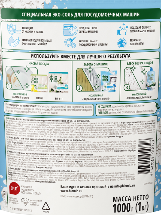 Экологичная соль BIO-SALT защищает от накипи вашу посудомоечную машину и продлевает срок ее службы. Смягчает воду, усиливает действие моющих средств и не дает известковому налету скапливаться на поверхности. В результате — чистая сияющая посуда без разводов. Эко-соль безопасна для использования в домах с автономной канализацией. Подходит для всех типов посудомоечных машин.