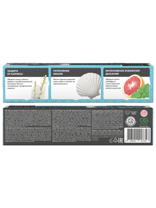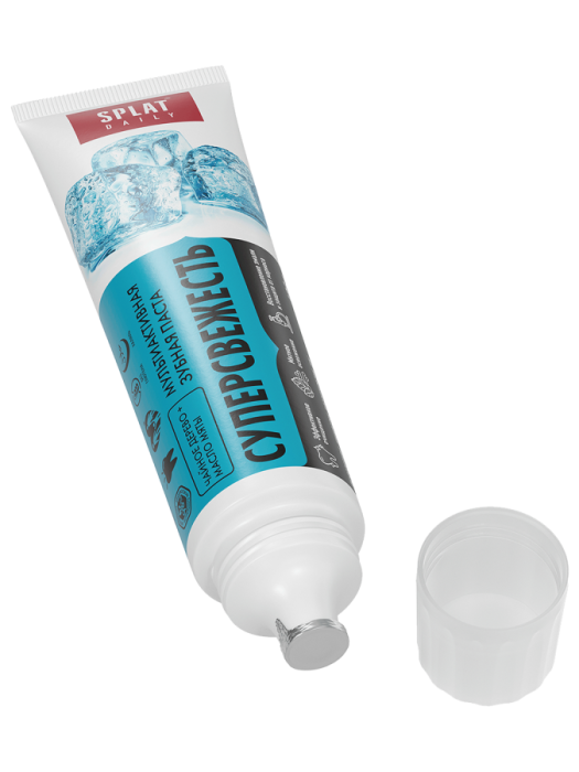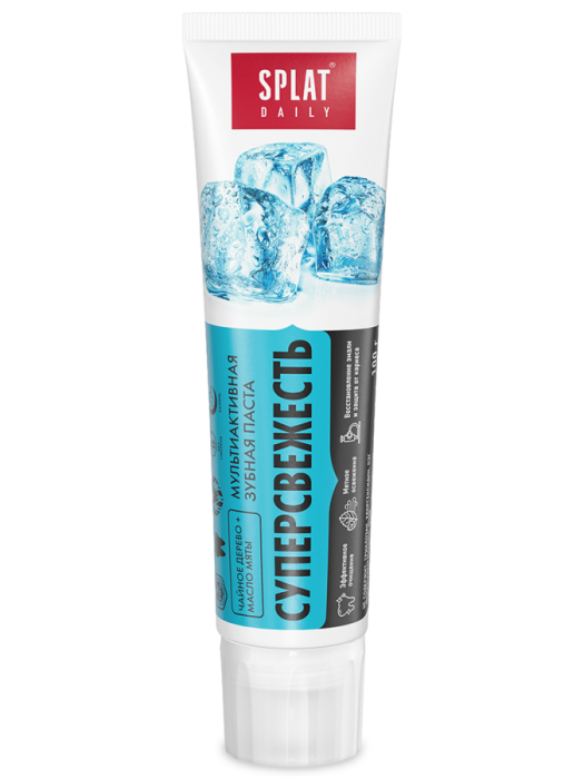 МУЛЬТИАКТИВНАЯ ЗУБНАЯ ПАСТА TEA TREE + MINT OIL SUPER FRESH ЭФФЕКТИВНОЕ ОЧИЩЕНИЕ МЯТНОЕ ОСВЕЖЕНИЕ ВОССТАНОВЛЕНИЕ ЭМАЛИ И ЗАЩИТА ОТ КАРИЕСА Содержит: ЭФИРНОЕ МАСЛО ЧАЙНОГО ДЕРЕВА И ЛАКТАТ КАЛЬЦИЯ Входящие в состав зубной пасты SPLAT DAILY SUPER FRESH эфирное масло чайного дерева и лактат кальция оказывают реминерализирующее и противокариесное действие. ЭФИРНОЕ МАСЛО МЯТЫ ПЕРЕЧНОЙ Эфирное масло мяты перечной проявляет антибактериальное действие, способствует снижению кровоточивости дёсен, освежает полость рта
