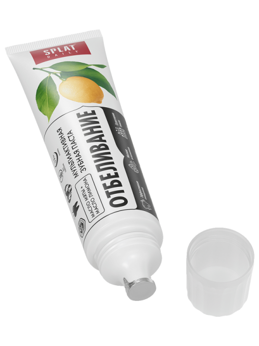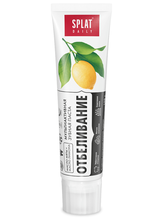 МУЛЬТИАКТИВНАЯ ЗУБНАЯ ПАСТА MINT OIL+ LEMON OIL WHITENING ЭФФЕКТИВНОЕ ОЧИЩЕНИЕ МЯТНОЕ ОСВЕЖЕНИЕ ОСВЕТЛЕНИЕ ЭМАЛИ Содержит: ЭФИРНЫЕ МАСЛА ЛИМОНА И МЯТЫ ПЕРЕЧНОЙ Натуральные эфирные масла лимона и мяты перечной мультиактивной зубной пасты SPLAT DAILY WHITENING обеспечивают свежесть дыхания. ЭФИРНОЕ МАСЛО МЯТЫ ПЕРЕЧНОЙ Эфирное масло мяты перечной проявляет антибактериальное действие, способствует снижению кровоточивости дёсен, освежает полость рта, обладает антисептическим действием. ПАПАИН И ПИРОФОСФАТЫ Папаи
