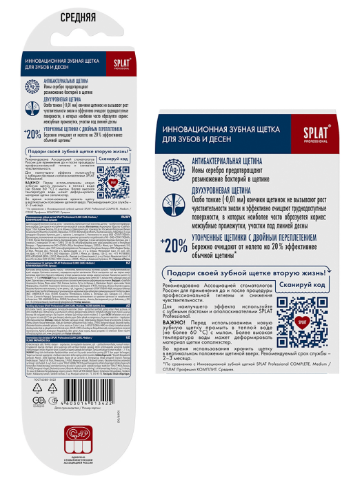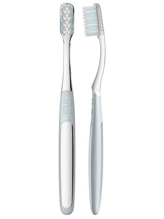 Зубная щетка Clinic Care с двумя видами щетины разной структуры и высоты разработана SPLAT® для глубокой чистки зубов по методу Басса. Эргономичную прорезиненную ручку удобно держать под углом 45 градусов к деснам, контролируя движения и силу давления на зубы. Утонченные витые щетинки центральных рядов создают мягкий плотный контакт с поверхностью зуба. Щетинки боковых поверхностей очищают межзубные промежутки. Инновационная двухуровневая щетина c ионами серебра не травмирует эмаль и десны при чистке.