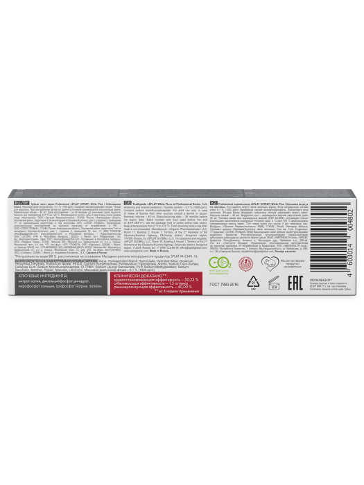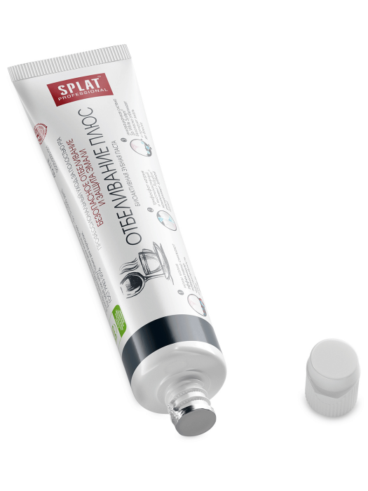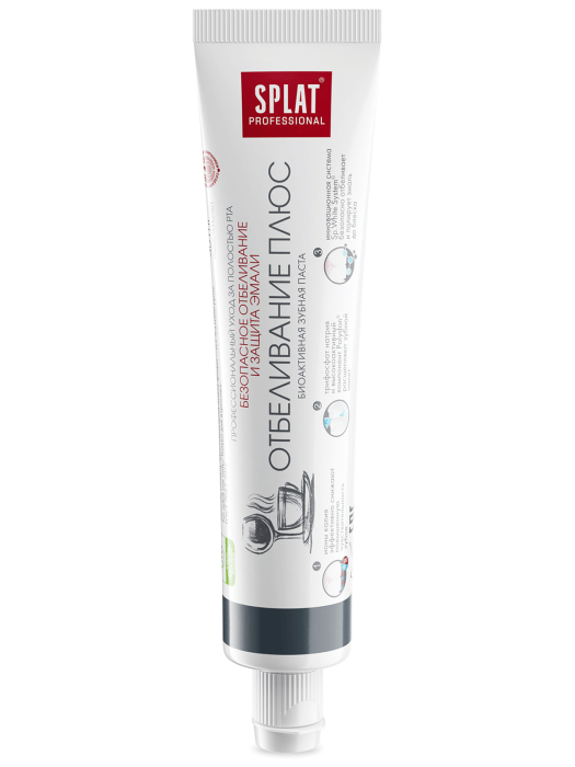 Зубная паста SPLAT Professional «Отбеливание Плюс» (WHITE PLUS) ухаживает за зубами и безопасно отбеливает их благодаря комплексу Sp.White System. За 4 недели использования эмаль становится светлее на 1,5 оттенка. Фермент папаин и отбеливающий компонент полидон эффективно расщепляют налет, способствуют сохранению белизны. Идеально подходит любителям кофе, чая и сигарет.