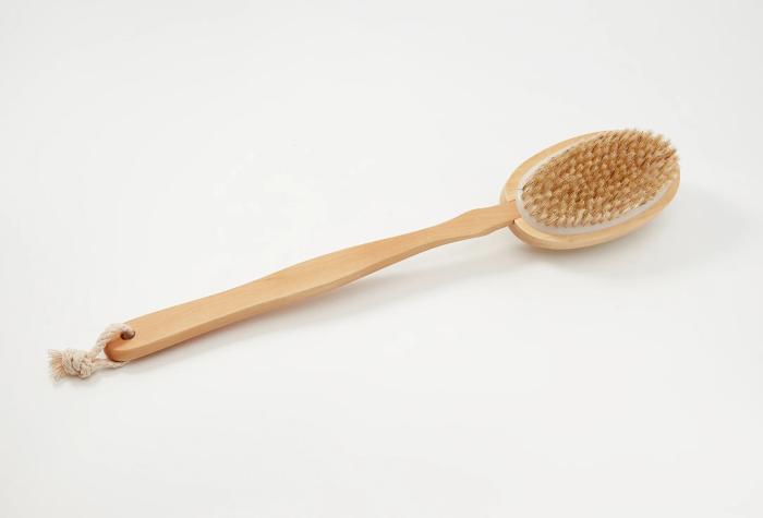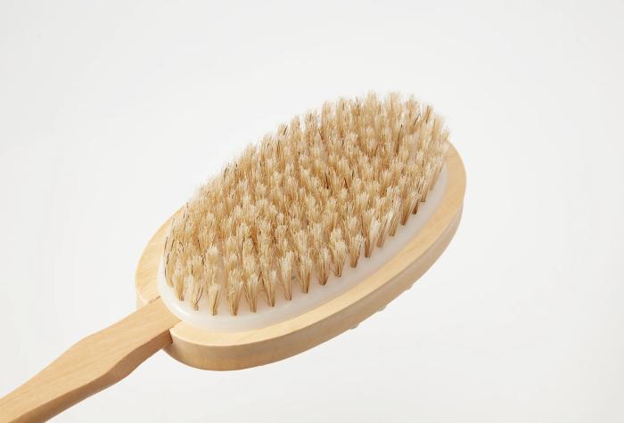 Щётка-массажер с ручкой. Очищает кожу, активизирует кровоснабжение в тканях. Для удобства мытья всего тела, особенно спины, используется съемная деревянная ручка. В конце ручки есть петелька, за которую удобно вешать щетку в ванной.