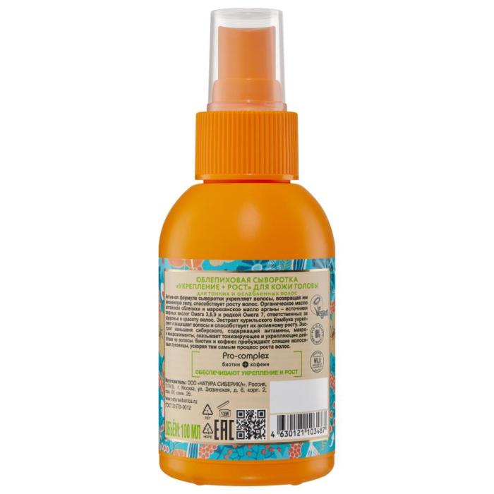 Активная формула сыворотки укрепляет волосы, возвращая им жизненную силу, способствует росту волос. Органическое масло алтайской облепихи и марокканское масло арганы - источники жирных кислот Омега 3,6,9 и редкой Омега 7, ответственных за здоровье и красоту волос. Экстракт курильского бамбука укрепляет и защищает волосы и способствует их активному росту. Экстракт женьшеня сибирского, содержащий витамины, макро- и микроэлементы, оказывает тонизирующее и укрепляющее действие на волосы. Биотин и Кофеин пробужд