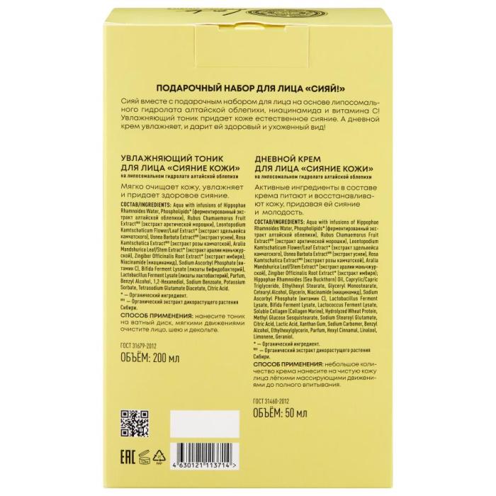 Сияй вместе с подарочным набором для лица на основе липосомального гидролата алтайской облепихи, ниацинамида и витамина С! Увлажняющий тоник придает коже естественное сияние. А дневной крем увлажняет, и дарит коже здоровый и ухоженный вид!