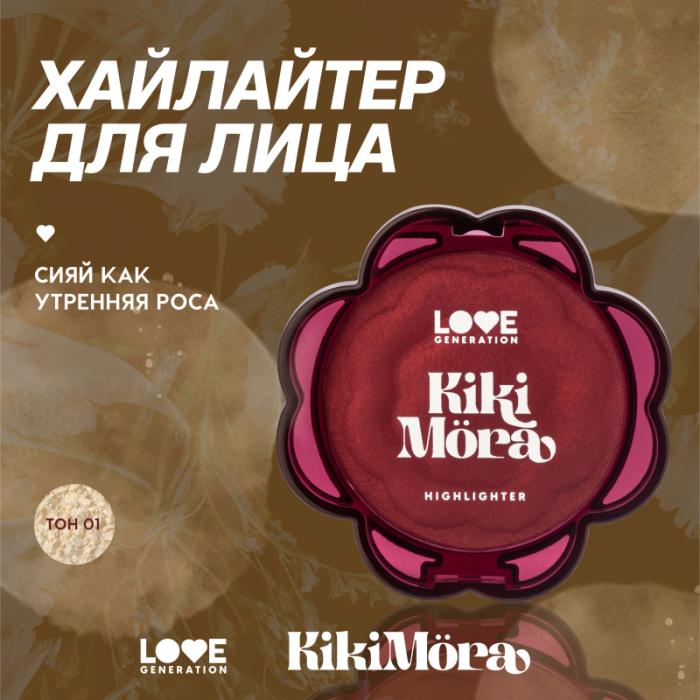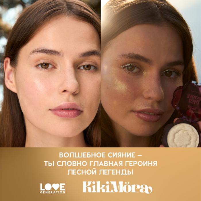 Компактный хайлайтер KIKIMORA в упаковке в форме цветочка. Полумуссовая шелковистая текстура легко набирается на кисть и мягко ложится на кожу, а мелкие сияющие частицы ловят свет под разными углами, создавая деликатное, но заметное свечение без намека на крупный шиммер.