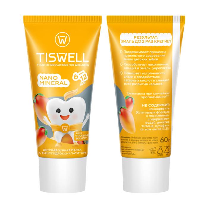 Зубная паста детская Tiswell со вкусом тропического манго – это эффективное средство для правильного созревания эмали зубов у детей. Зубная паста разработана NANO MINERAL с активной концентрацией наногидроксиапатита и аргинина. Паста с наногидроксиапатитом образует на поверхности зубов активный минеральный слой и способствует накоплению кальция в эмали. Зубная паста с фруктовым вкусом подарит ребенку удовольствие от чистки зубов! Паста подходит для детей от 6 до 12 лет. Результат использования: зубная эмаль