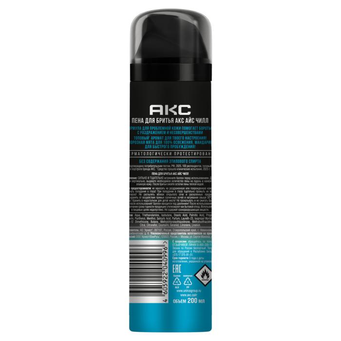 Пена для бритья для мужчин с охлаждающим эффектом Акс Айс Чилл – это идеальное косметическое средство для ухода за кожей с топовым* запахом мандарина и морозной мяты, разработанное для взрослых мужчин и подростков с 14 лет с проблемной и склонной к несовершенствам кожей лица.