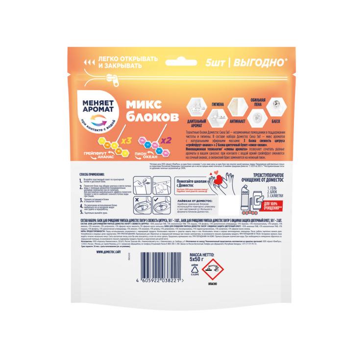 Доместос шарики для унитаза МИКС АРОМАТОВ — это эффективное решение для поддержания чистоты вашего туалета. Инновационная технология' «смены запаха» позволяет сочетать разные ароматы в вашем санузле: при контакте с водой яркий грейпфрут сменяется на сочный ананас, а океанский бриз заменяется на нежный пион. Набор 5 шт: 3 блока(грейпфрут+ананас) и 2 блока(пион+океан). Таблетки для туалета хранятся в герметичном зип-пакете, который удобно открывать и закрывать.