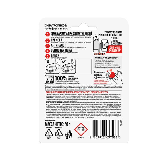 Сменный подвесной блок для унитаза Доместос Сила тропиков — это идеальное решение для поддержания гигиены туалета. Шарики заполняют туалетную комнату ароматом свежего грейпфрута, а при смывании – запахом сочного тропического ананаса. Средство нейтрализует неприятные запахи. Таблетки для туалета эффективно борются с налетом и освежают воздух. Ароматизатор удобен в использовании и легко устанавливается. Набор – 3 шт.