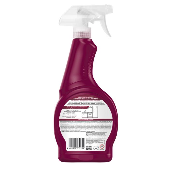 Чистящее средство Антижир + Защита для кухни Сиф — это ваш надежный помощник в борьбе с нагаром и другими загрязнениями. Спрей для уборки в формате крем-пены обеспечивает поверхностям не только идеальную чистоту, но и долговременную защиту. Чистящий крем расщепляет до 100% жира'. Крем-пена для кухни, плиты и духовки содержит активные компоненты, которые эффективно борются с загрязнениями. 'очищение до 100% типичных загрязнений по результатам инструментальных тестов, при соблюдении рекомендаций по применению