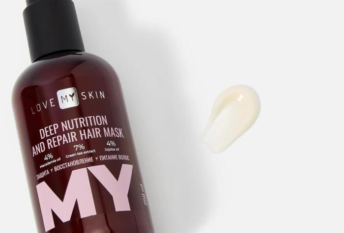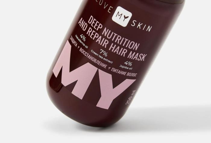 Маска LOVE MY SKIN для интенсивного длительного питания тусклых, сухих и обезвоженных волос с маслами жожоба, макадамии и авокадо, экстрактами зелёного чая, бамбука и витамином Е.