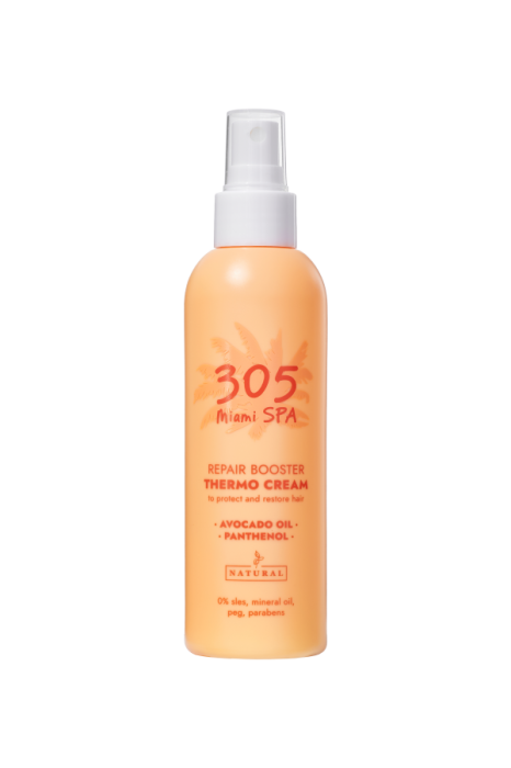 Несмываемый термозащитный крем - спрей для волос с маслом авокадо и пантенолом это отличная альтернатива салонным продуктам и качественный уход в домашних условиях. В составе ароматизированной несмывашки Repair Booster Thermo Cream от 305 Майами СПА — натуральные активные компоненты, оказывающие укрепляющее, разглаживающее и увлажняющее действие. Масло авокадо питает и разглаживает волосы. Пантенол придаёт блеск, обладает увлажняющими, успокаивающими свойствами. Органические омега-кислоты, входящие в состав масла персиковой косточки, укрепляют волосы и предотвращают появление секущихся кончиков. Протеины шелка способны проникать внутрь поврежденного волоса, восстанавливать и защищать волосы от внешнего воздействия. Частое использование фена и стайлинговых средств негативно влияет на состояние волос, делая их сухими и ломкими, поэтому важно использовать несмываемые средства, которые обеспечивают длительное питание, увлажнение и защиту от агрессивного воздействия. Несмываемый крем-спрей разработан специально для защиты от термического воздействия при использовании утюжков и фена. Он увлажняет и питает волосы на протяжении всего дня, не утяжеляя их. Термозащитные полимеры образуют надежную защиту от высоких температур, сохраняя блеск и упругость волос. Активные натуральные компоненты восстанавливают структуру волос, предотвращая их сечение и пушистость. Крем-спрей легко наносится, быстро впитывается, не утяжеляет волосы, делает их послушными, мягкими и блестящими. Применение крем-спрея для волос с маслом авокадо, пантенолом и протеинами шёлка позволяет сохранить здоровый и ухоженный вид волос. защита от теплового воздействия, укрепление и восстановление структуры волос, продление стойкости укладки. Активные компоненты:Масло авокадо – обладает высокой термостабильностью, является эффективным антиоксидантом, источником витаминов и минеральных веществ, укрепляет, питает и защищает волосы. Пантенол – обладает мощным увлажняющим и укрепляющим действием, придаёт волосам здоровый блеск, уплотняет волосы. Комплекс аминоки