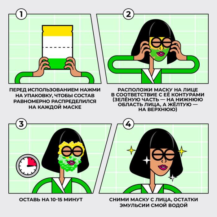 Пузырьковая маска для лица CRAZY BUBBLES 2-COLOR CLEANSING MASK от Professor SkinGOOD (Профессор Скингуд) разделена на 2 части - разные компоненты воздействуют на T- и U-зоны, учитывая анатомические особенности разных участков кожи. Экстракты цитрусовых, зеленого чая, мяты перечной, AHA-кислоты и гамамелис в составе тканевой маски для лица очищают и тонизируют, снимают воспаление и успокаивают проблемную T-зону лица (маска желтого цвета). Эти компоненты прекрасно взаимодействуют между собой и способствуют глубокому и интенсивному очищению самых проблемных участков кожи. U-зона - более нежная часть лица, которой необходимы более щадящие очищающие компоненты: экстракт центеллы азиатской, конопли, чайного дерева, ромашки и алоэ. Они мягко очищают и успокаивают чувствительную зону лица (маска зеленого цвета). В ассортименте 7 корейских масок для лица. Продукция не тестируется на животных. СПОСОБ ПРИМЕНЕНИЯ: Рекомендуем использовать пузырьковую маску 1-2 раза в неделю. Перед использованием нажмите на упаковку, чтобы состав равномерно распределился на каждой маске. Расположите маску на лице в соответствии с её контурами (зеленую часть - на нижнюю область лица, а желтую - на верхнюю) . Оставьте на 10-15 минут. Снимите маску, остатки эмульсии смойте водой. После использования маски рекомендуем наносить сыворотку для лица SKIN VITAMIN BRIGHTENING SERUM и крем для лица HYDRO DREAM FACE CREAM от Professor SkinGOOD.