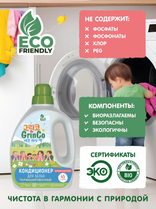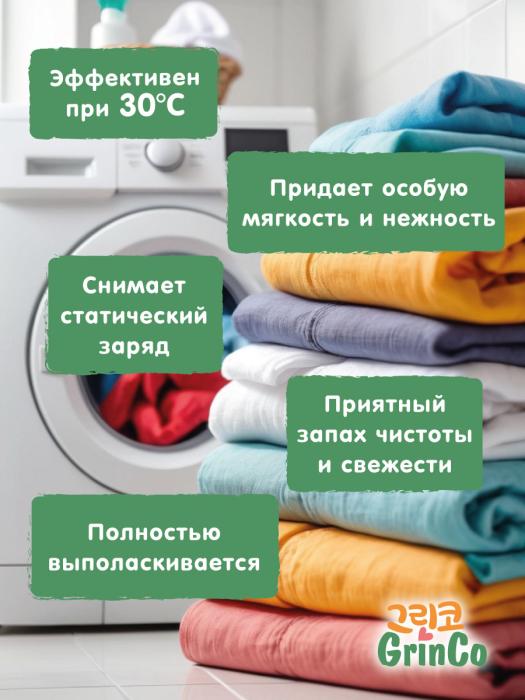 Концентрированный кондиционер для белья GrinCo это средство, которое бережно ухаживает за разными типами ткани. Специальная формула, взаимодействуя с волокнами ткани, восстанавливает ее, делает мягкой шелковистой и устраняет неприятные запахи. Кондиционер облегчает глажение, снимает статическое электричество, а также позволяет сохранить цвет и структуру ткани даже после многократных стирок. При регулярном применении кондиционера для белья GrinCo ваша одежда будет свежей и яркой, насыщенной легким, нежным ароматом.Кондиционер подходит для цветного, белого, черного белья из хлопка, шерсти, вискозы, ткани из синтетических и смешанных волокон (не использовать для мембран и водоотталкивающих волокон), ручной и машинной стирки