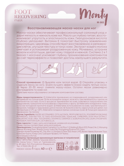 ① Вымойте ноги теплой водой. ② Откройте упаковку и наденьте маску на ноги. ③ Для лучшего эффекта можно надеть теплые носки. ④ Через 20-30 минут снимите маску-носки. Остатки маски равномерно распределите по коже ног.