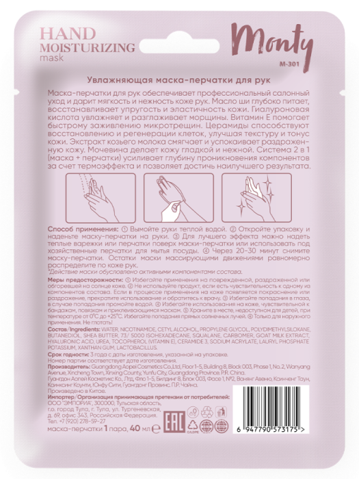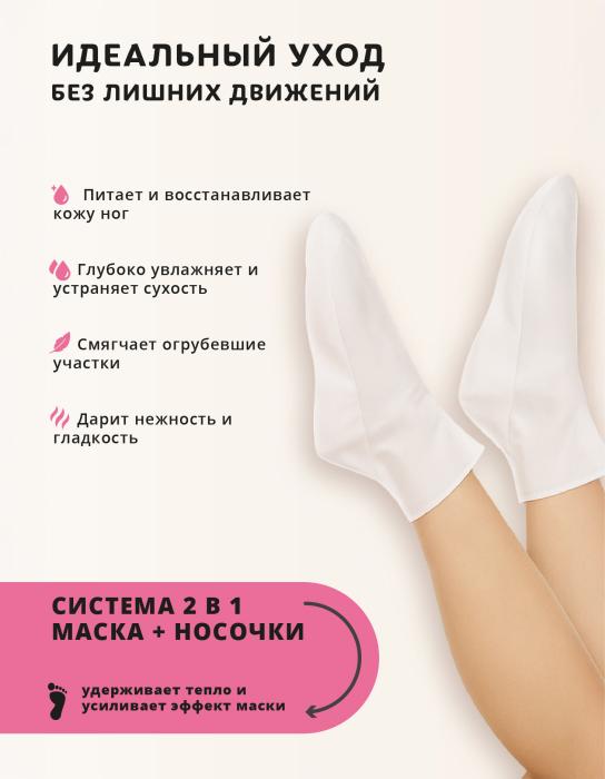 ① Вымойте руки теплой водой. ② Откройте упаковку и наденьте маску-перчатки на руки. ③ Для лучшего эффекта можно надеть теплые варежки или перчатки поверх маски-перчатки или использовать под хозяйственные перчатки для мытья посуды. ④ Через 20-30 минут снимите маску-перчатки. Остатки маски массирующими движениями равномерно распределите по коже рук.