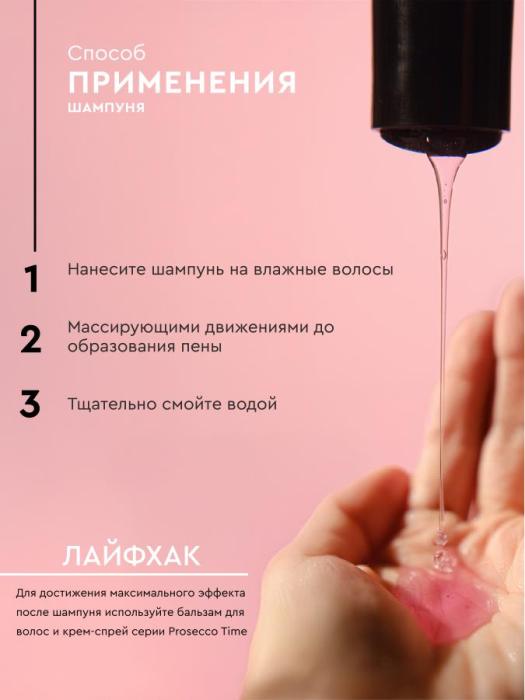 нанесите шампунь на влажные волосы массирующими движениями до образования пены, тщательно смойте водой. При необходимости повторите процедуру. Для достижения максимального эффекта после шампуня используйте бальзам для волос и крем-спрей серии Prosecco Time