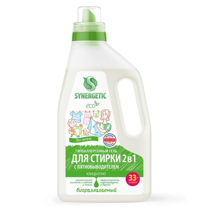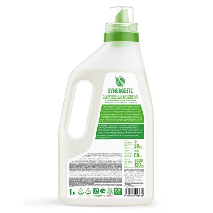 Биоразлагаемый концентрированный гипоаллергенный гель для стирки 2 в 1 c пятновыводителем SYNERGETIC предназначен для стирки всех видов тканей (кроме деликатных и мембранных) в стиральных машинах любого типа и ручной стирки при температуре от 15 °C до 90 °C, а также для предварительной обработки пятен. Средство обеспечивает гигиеническую чистоту тканей, эффективно устраняя пятна и неприятные запахи, а также заботится о ткани, сохраняя насыщенность цвета, первоначальный вид, прочность и структуру. Комбинация энзимов и растительных ПАВ эффективно удаляет загрязнения и свежие пятна с волокон ткани даже в холодной воде и при коротких циклах стирки, не оставляет разводов. Универсальный гель подходит для цветного и белого белья из натуральных и синтетических тканей, детского белья 0+ и одежды людей с чувствительной кожей. Средство легко выполаскивается из тканей, не содержит ароматизаторов, красителей, фосфатов, фосфонатов, акрилатов, агрессивных ПАВ, SLS, ЭДТА.