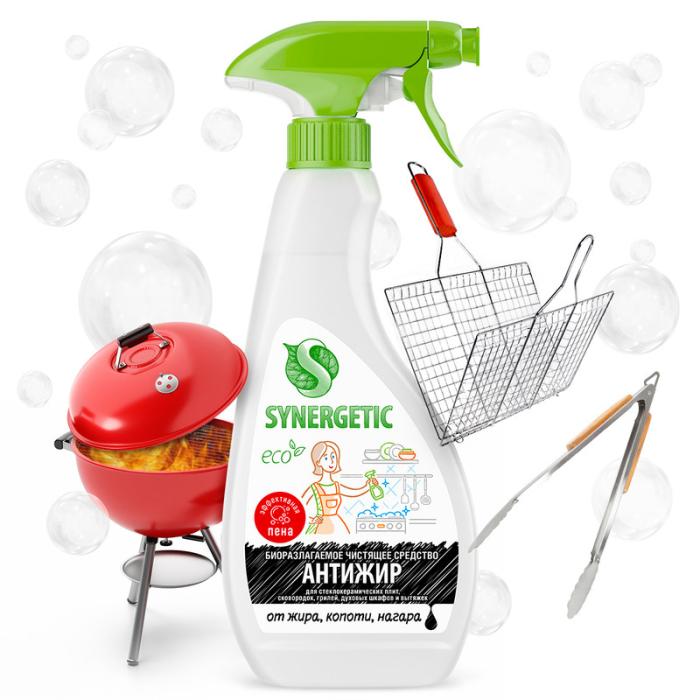 Высокоэффективное чистящее средство "Антижир" SYNERGETIC с усиленной формулой предназначено для уборки кухонных поверхностей от стойких жировых загрязнений, копоти, нагара, масляных пятен и накипи. Устраняет неприятные запахи. Легко смывается водой без разводов. Эффективно даже в холодной воде. Предназначено для стеклокерамических, металлических, эмалированных плит и поверхностей, сковородок, противней, кастрюль, шампуров, решёток-гриль, пароконвектоматов, микроволновок, вытяжек, духовых шкафов, каменных столешниц, керамической плитки и других кухонных поверхностей. Эффективная стойкая пена отлично распределяется по поверхности и обеспечивает быстрое удаление въевшегося и пригоревшего жира, не оставляя царапин. Обладает свежим цитрусовым ароматом благодаря гипоаллергенной парфюмерной композиции. Средство подходит для уборки в детских учреждениях. Биоразлагаемые компоненты не вредят микрофлоре септических установок при использовании средства в соответствии со способом применения.
