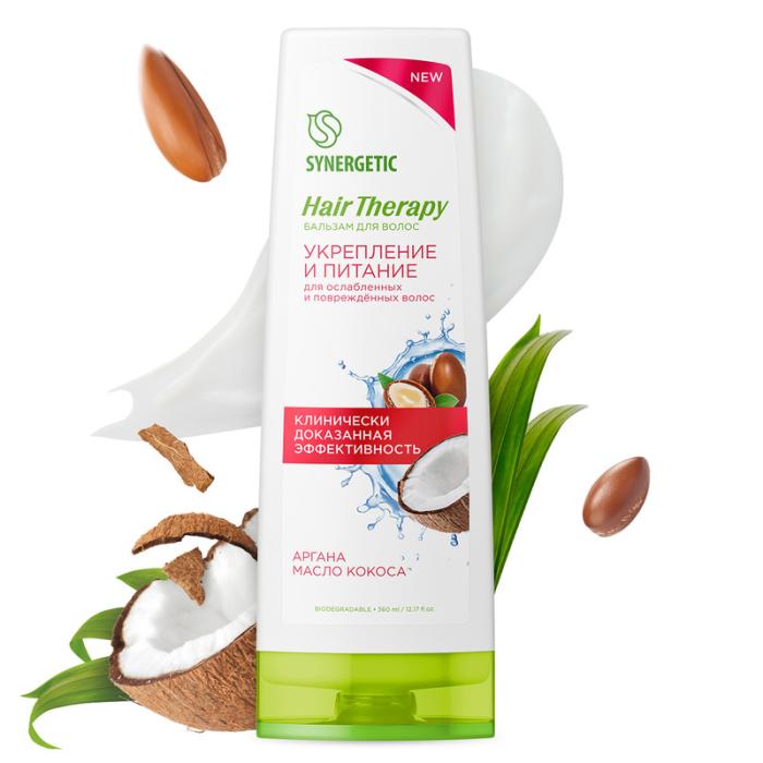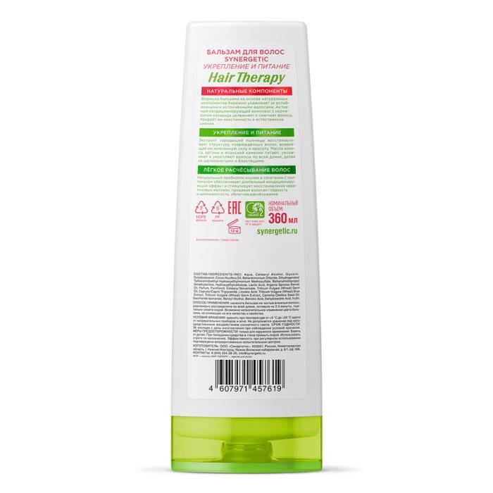 Бальзам для волос SYNERGETIC "Укрепление и питание" HAIR THERAPY - эффективное и безопасное средство для ухода за всеми типами волос. Формула бальзама на основе натуральных компонентов бережно ухаживает за ослабленными и истонченными волосами. Активный кондиционирующий комплекс с изомератом сахарида увлажняет и смягчает волосы, придает им эластичность и естественное сияние. Экстракт зародышей пшеницы восстанавливает структуру поврежденных волос, возвращая им жизненную силу и блеск. Масла кокоса, арганы и японской камелии питают, увлажняют и укрепляют волосы по всей длине. Натуральный пребиотик инулин в сочетании с пантенолом обеспечивает длительный кондиционирующий эффект и стимулирует восстановление кератиновых волокон, придавая волосам гладкость и шелковистость, облегчая расчесывание. Эффективность бальзама при регулярном использовании подтверждена аккредитованным испытательным центром.