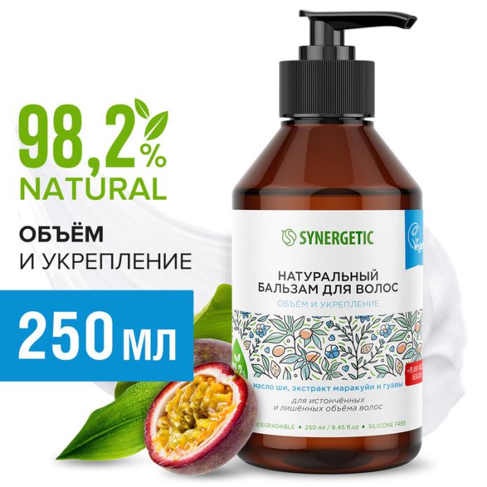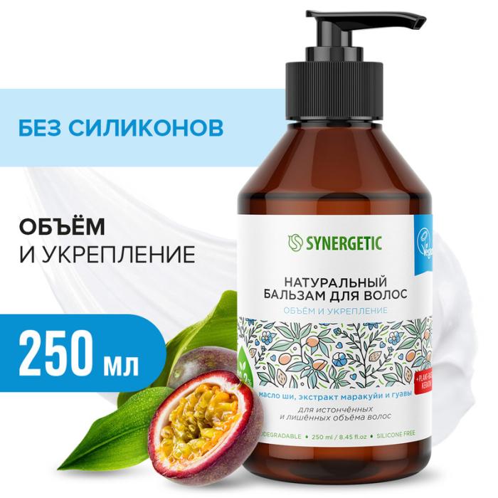Натуральный бальзам для волос SYNERGETIC "Объем и укрепление волос" - эффективное средство для ухода за истонченными и лишенными объема волосами, более чем на 98% состоящее из натуральных компонентов. Формула на основе растительных компонентов возвращает жизненную силу истонченным и лишенным объема волосам. Активный кондиционирующий комплекс придает волосам эластичность, смягчает и увлажняет их. Растительный кератин восстанавливает структуру волос изнутри, придает им плотность и упругость. Специально разработанная формула на основе масел ши и кокоса питает тонкие ослабленные волосы и увеличивает объем, а натуральные экстракт гуавы и маракуйи придают им эластичность и блеск. Натуральные растительные эмоленты облегчают расчесывание волос и обеспечивают длительный кондиционирующий эффект. Они эффективно смягчают, делая волосы гладкими, блестящими и ухоженными.