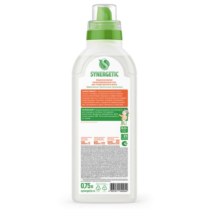 Биоразлагаемый концентрированный гель для стирки SYNERGETIC для цветного белья предназначен для стирки цветного белья в стиральных машинах любого типа и ручной стирки при температуре 20-90 °C. Уникальный комплекс растительных тензидов, натурального мыла и зеленых хелатов обеспечивает бережное и эффективное очищение цветных тканей. Функциональные добавки предотвращают повторное оседание загрязнений и окрашивание ткани, сохраняя ее первоначальный вид, насыщенность цвета, прочность и структуру. Гипоаллергенная парфюмерная композиция с эфирными маслами жасмина, пачули, нероли, розы и ветивера оставляет легкий и приятный аромат. Биоразлагаемый гель безопасен для природы и человека, не содержит красителей, фосфатов, фосфонатов, ЭДТА и агрессивных ПАВ. Средство легко выполаскивается из тканей. Биоразлагаемые компоненты не вредят микрофлоре септических установок при использовании средства в соответствии со способом применения.
