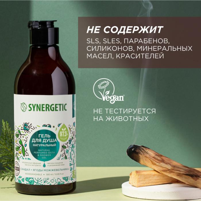Натуральный биоразлагаемый гель для душа SYNERGETIC "Сандал и ягоды можжевельника" - это деликатное средство для очищения кожи. Растительные компоненты, натуральные масла, экстракты и уникальный аромат - вот рецепт парфюмированного геля для душа SYNERGETIC. Гипоаллергенная парфюмерная композиция разработана в швейцарском доме Givaudan, где уже более ста лет создают ароматы, которые используются во всем мире в парфюмерии и косметике. Аромат геля для душа разработан с использованием натуральных эфирных масел пачули, ладанника, герани, гурьюнского бальзама и розового перца. Комплекс витаминов-антиоксидантов защищает кожу от вредных воздействий окружающей среды и восстанавливает барьерные функции кожи. Масла бабассу и сладкого миндаля оказывают регенерирующее действие, питают и увлажняют сухую кожу, делая её гладкой и бархатистой. Экстракты сандалового дерева и можжевельника увлажняют кожу и оказывают тонизирующий эффект. Мультифункциональный компонент натурального происхождения софоролипид мягко очищает и сохраняет естественный микробиом кожи.