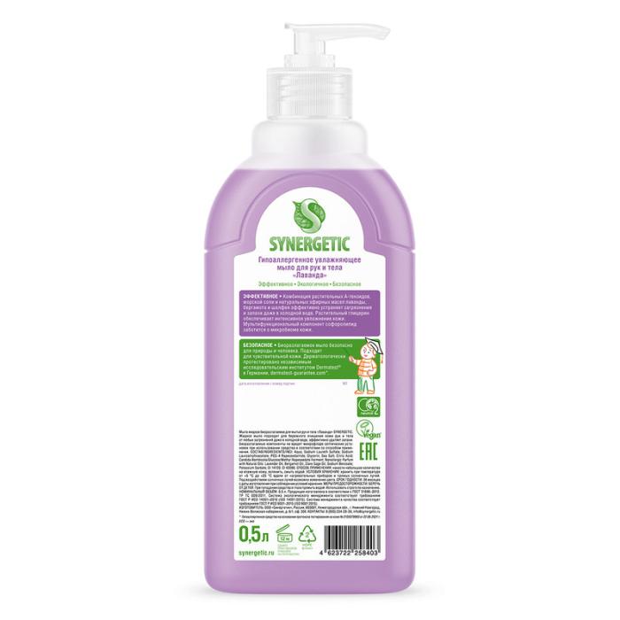 Биоразлагаемое увлажняющее мыло SYNERGETIC "Лаванда" подходит для бережного очищения кожи рук и тела от любых загрязнений. Комбинация растительных А-тензидов, морской соли и натуральных эфирных масел лаванды, бергамота и шалфея эффективно устраняет загрязнения и неприятные запахи даже в холодной воде. Растительный глицерин обеспечивает интенсивное увлажнение кожи. Мультифункциональный компонент софоролипид мягко очищает и заботится о естественном микробиоме кожи. Гипоаллергенное средство подходит для чувствительной кожи. Мыло дерматологически протестировано независимым исследовательским институтом Dermatest®️ в Германии. Биоразлагаемые компоненты безопасны для природы и человека и не вредят микрофлоре септических установок при использовании средства в соответствии со способом применения. Жидкое мыло не содержит компонентов животного происхождения, не тестируется на животных и сертифицировано британской организацией The Vegan Society. Знак Vegan - мировой стандарт этичной продукции.