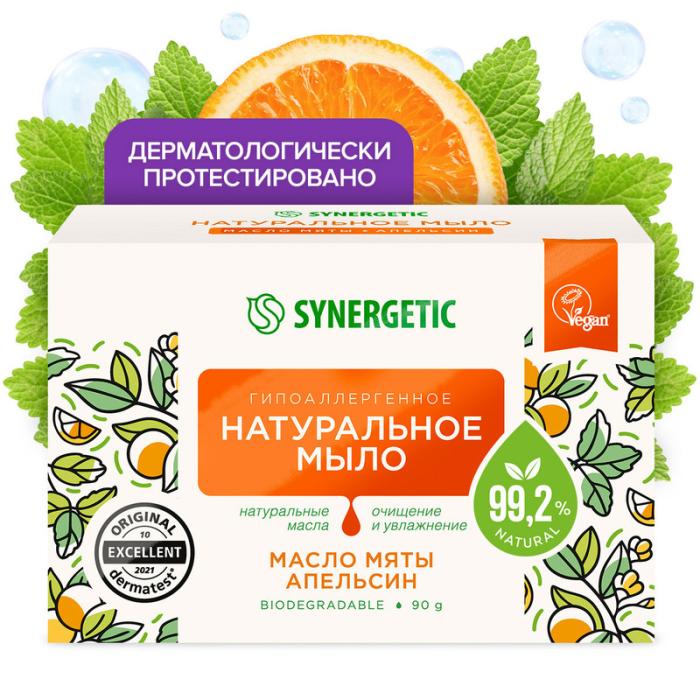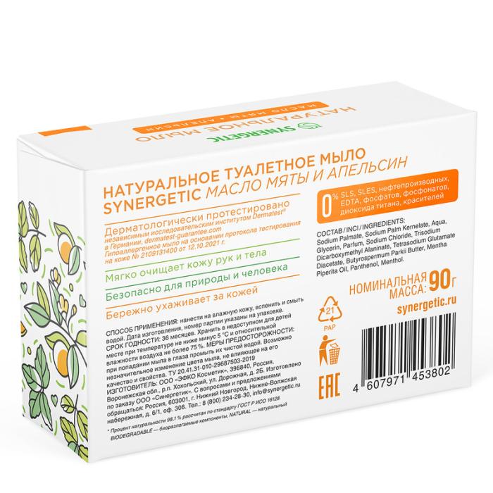 Натуральное кусковое туалетное мыло SYNERGETIC "Масло мяты и апельсин" - средство для мягкого очищения и ухода за кожей. Мыло имеет натуральную основу, изготовленную из растительных масел, которые бережно воздействуют на кожу, предохраняя от пересушивания при частом мытье рук. Натуральные эфирные масла и экстракты оказывают дополнительный уход и восстановление, а зелёные хелаты не наносят вред окружающей среде. Пантенол - незаменимый по эффективности компонент для защиты сухой и чувствительной кожи, он усиливает действие увлажняющих компонентов и способствует восстановлению барьерных функций. Парфюмерная композиция на основе натуральных эфирных масел эвкалипта, апельсина и перечной мяты оставляет на коже потрясающий аромат.